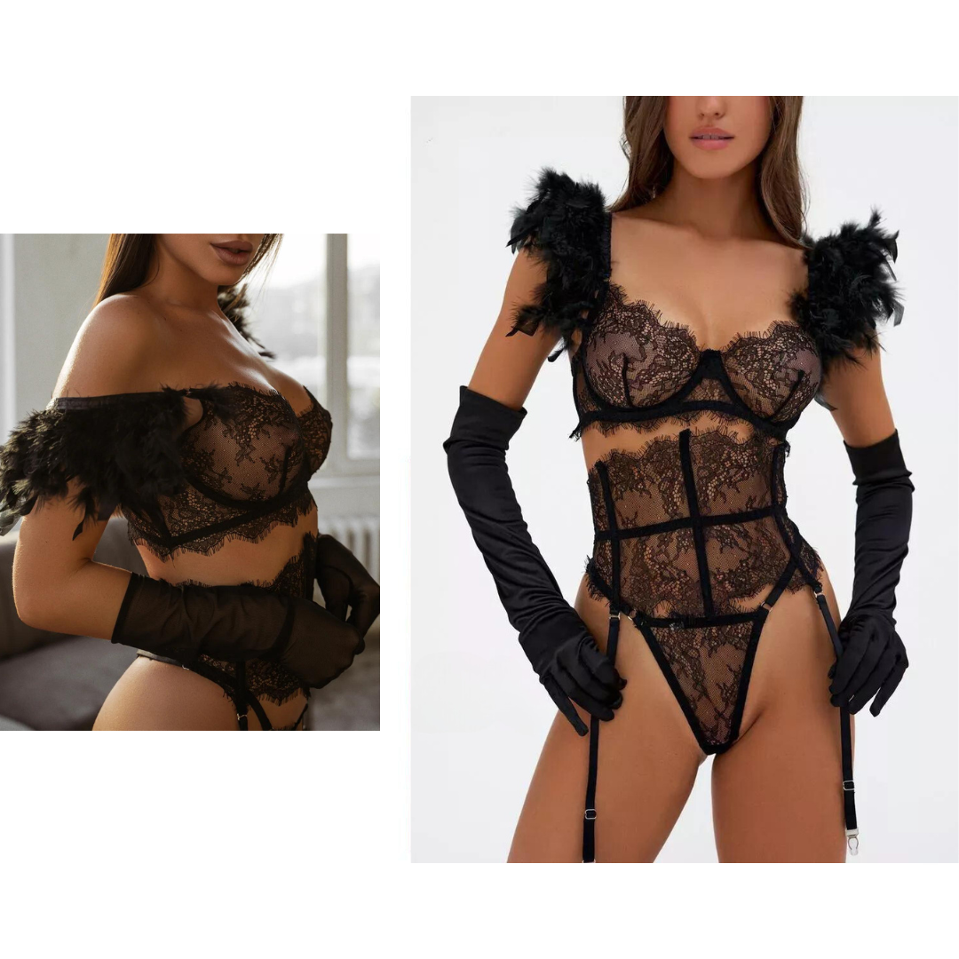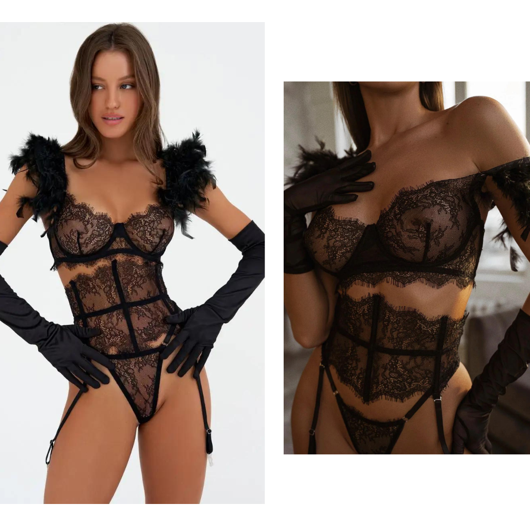 Träumen Sie davon, sich mit einem einzigartigen und unvergesslichen Stück abzuheben? Das SOLAR-Set ist für diejenigen konzipiert, die keine Angst haben, mutig zu sein. Mit seiner sinnlichen schwarzen Spitze und den strategischen Riemen betont es jede Kurve und verleiht Ihnen einen mutigen und fesselnden Look, der niemals unbemerkt bleibt.